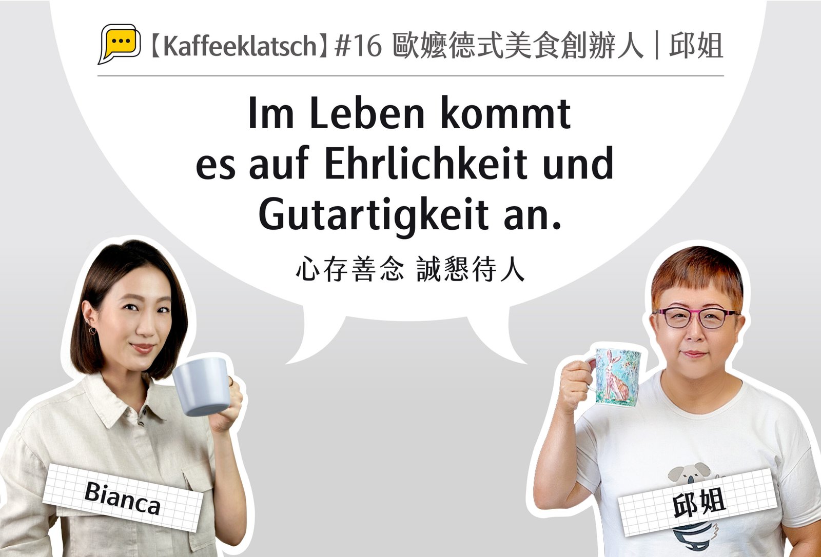 - (60:00) 歐嬤品牌核心價值,也鼓勵大家:„Im Leben kommt es auf Ehrlichkeit und Gutartigkeit an.“ 「心存善念,誠懇待人」