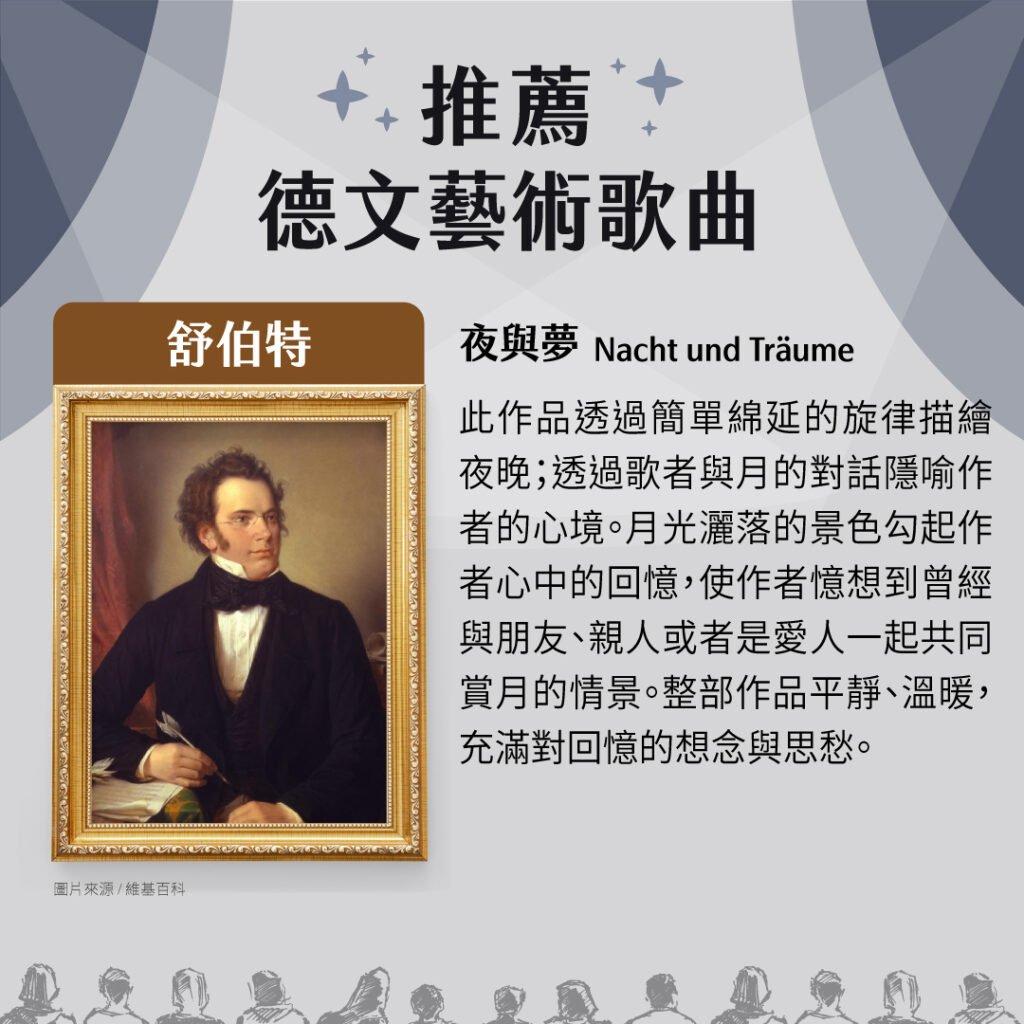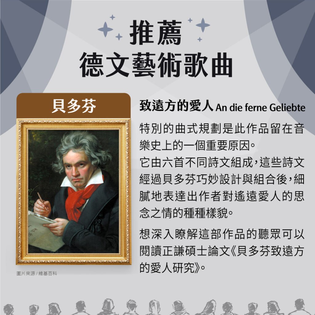 大家如果有興趣聽德文藝術歌曲的話,比較早期的作品可以聽聽看,像是貝多芬、舒伯特以及舒曼這幾位作曲家的作品。
