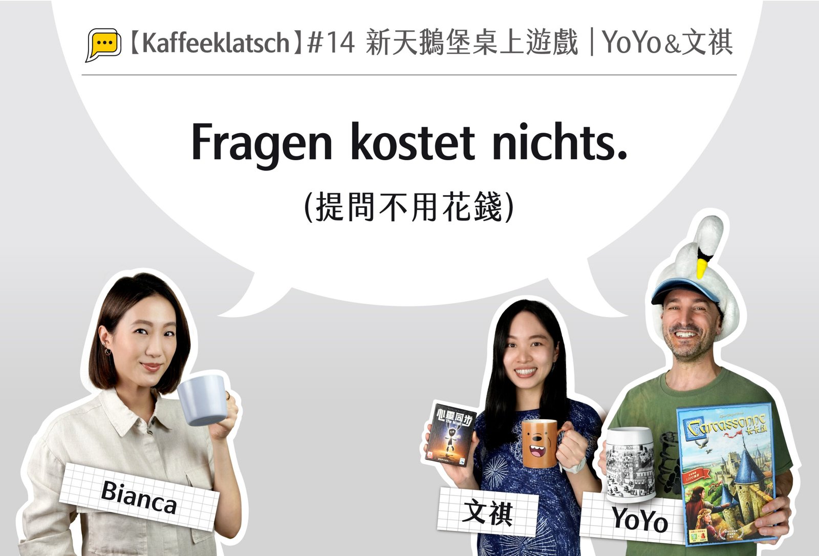 這集 „Kaffeeklatsch mit Bianca“ ,我們把新天鵝堡桌上遊戲的創辦人YoYo及多才多藝的文祺邀請到節目上來了!